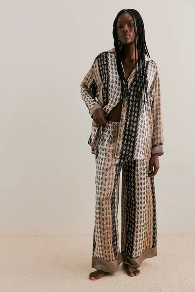 So essential pajama set featured in a soft printed fabrication and oversized silhouette with a long-sleeve top and matching wide-leg bottoms.