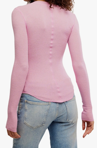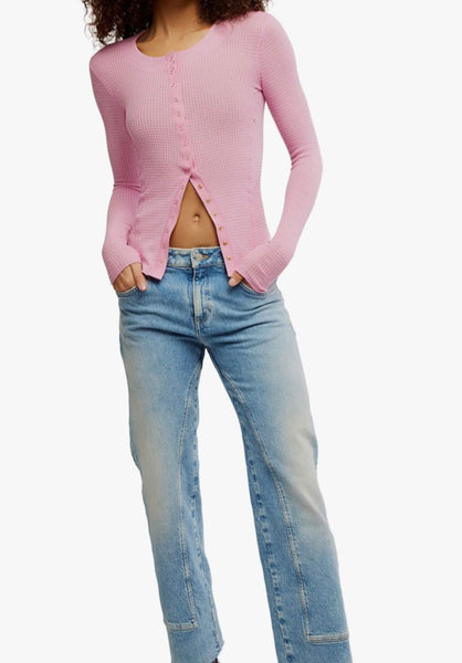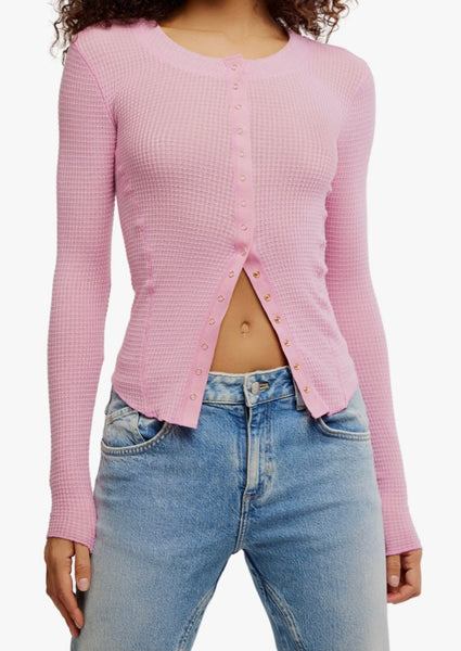 A fitted silhouette and effortless waffle knit fabrication with button-front closure for multiple ways to wear.
