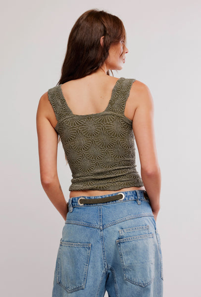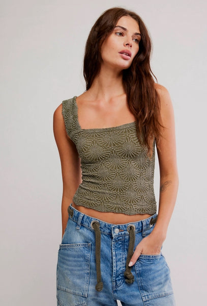 So sweet cami featured in a cropped, square-neck silhouette and jacquard floral design with statement lettuce-edge hemline.