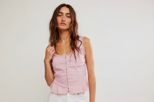 This vintage-inspired top, featuring a flattering, corset-style silhouette, a lightweight cotton fabrication, and a dainty embroidered trim for a sweet touch.