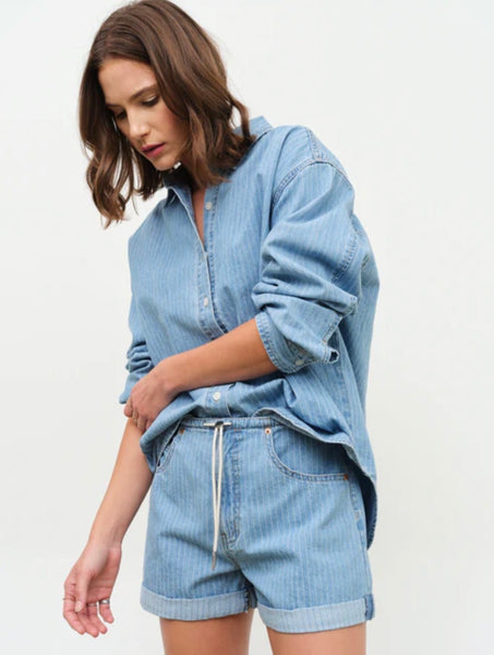 The Haven Long Sleeve Shirt in Whimsy is an easy oversized button-up designed for effortless layering. Featuring a soft light wash with subtle vertical striping, this relaxed silhouette.