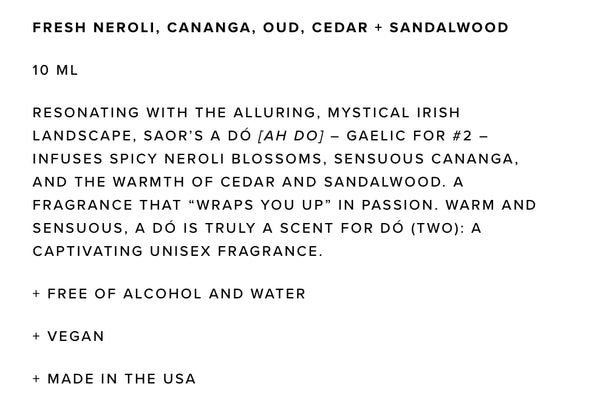 RESONATING WITH THE ALLURING, MYSTICAL IRISH LANDSCAPE, SAOR’S A DÓ [AH DO] – GAELIC FOR #2 – INFUSES SPICY NEROLI BLOSSOMS, SENSUOUS CANANGA, AND THE WARMTH OF CEDAR AND SANDALWOOD. A FRAGRANCE THAT “WRAPS YOU UP” IN PASSION. WARM AND SENSUOUS, A DÓ IS TRULY A SCENT FOR DÓ (TWO): A CAPTIVATING UNISEX FRAGRANCE.