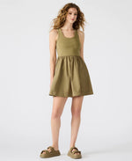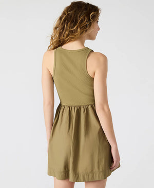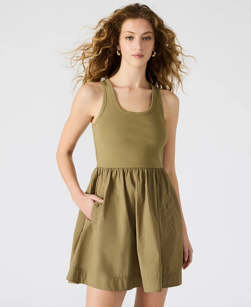 A knit-to-fit rib bodice gives way to a swishy skirt with pockets.